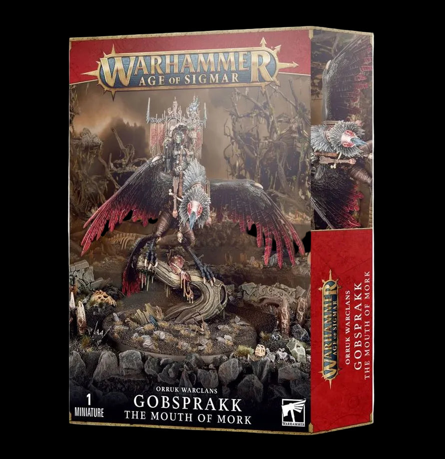 In battle, Gobsprakk takes to the skies on his Corpse-rippa Vulcha, the blood-stained Killabeak. From this lofty perch, he is able to bellow commands to the orruks he commands whilst hurling hexes and incantations that hinder and harm his foes.