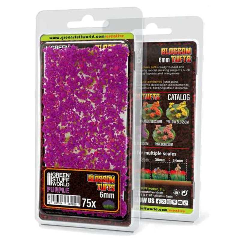 Innovativi ciuffi con fiore (o Blossom Tufts in inglese) autoadesivi perfetti per decorare basi per miniature, modellini, scenografie, paesaggi, sentieri, ecc... Basta staccare gli arbusti con delle pinzette, e fissarli con la loro colla autoadesiva sulla superficie da decorare. Prendere in considerazione che, nonostante siano autoadesivi, una goccia di colla potrebbe esser necessaria su alcune superfici irregolari per ottenere una soluzione permanente.