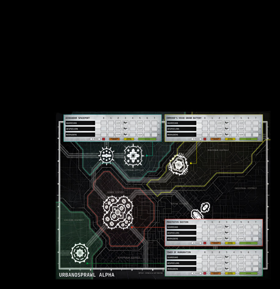 Included with the book are a set of photocopiable assets comprising two Crusade cards and an Order of Battle, as well as a double-sided A2 poster depicting the Urbanosprawl Alpha which can be used to track Campaign progress. The reverse side shows artwork of the Adepta Sororitas battling the Night Lords.