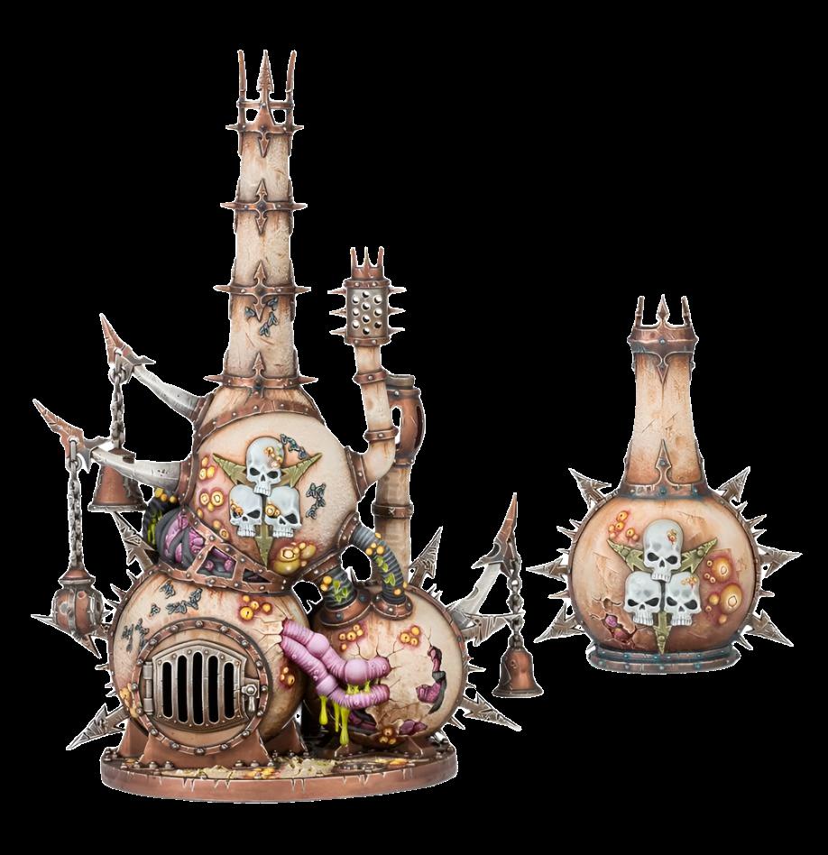 Diffondi la tua presenza tossica su qualsiasi mondo su cui si reca la tua armata grazie ai Malignificatori Miasmici. Formati da una ciminiera principale e da una più piccola fornace della peste, è un ottimo modo per portare le benedizioni/maledizioni (come preferisci) di Nurgle sul tavolo da gioco. È anche stato pensato per essere collocato sopra a una Sector Mechanicus Ferratonic Furnace, in modo da creare un'immensa macchina di corruzione.