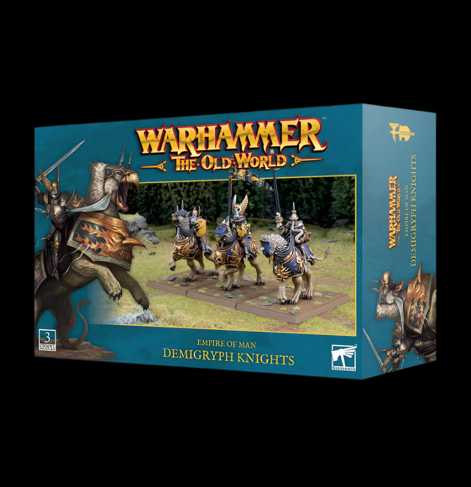 This multipart plastic kit builds three Demigryph Knights for use in your Empire of Man army in Warhammer: The Old World. Each of these armoured knights can be equipped with either a long-handled halberd or a lance, and there are parts to build an optional champion, standard bearer, and musician. You can customise your unit further with different shield designs and heads.