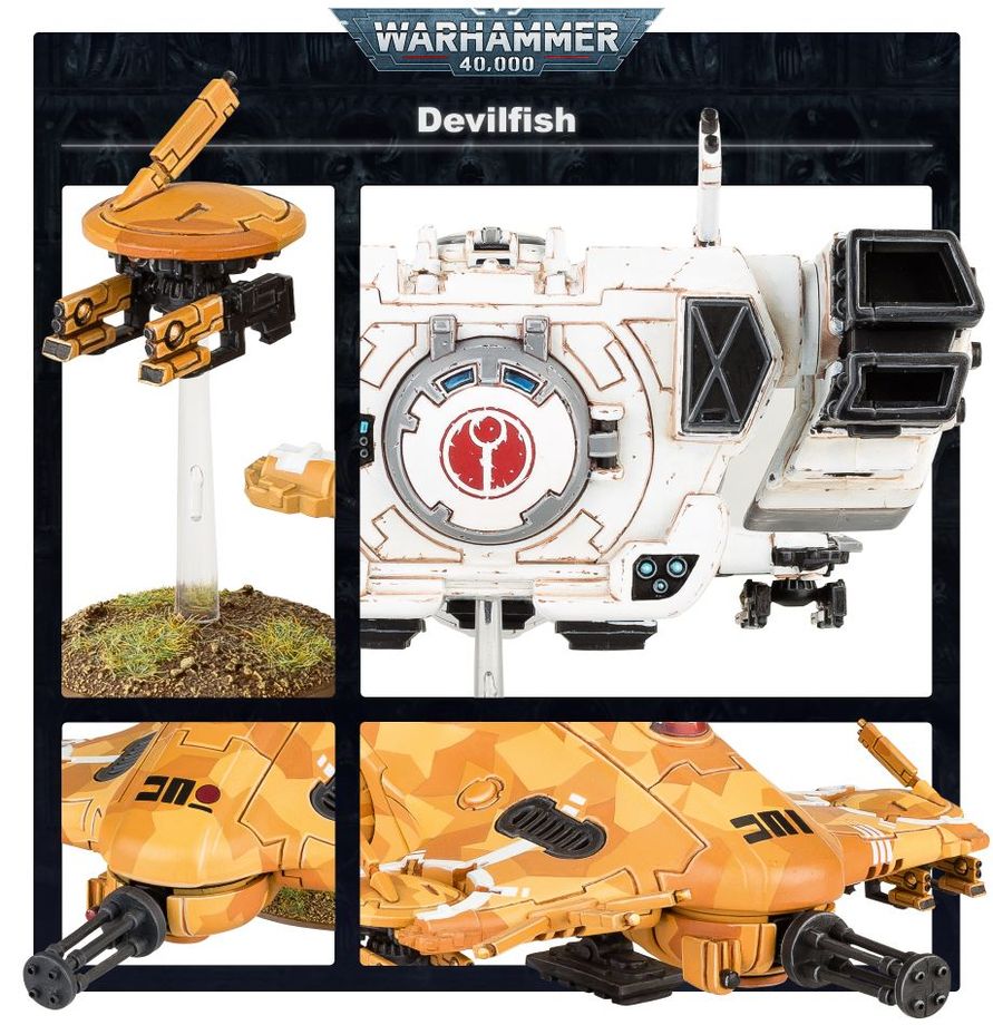 Il Devilfish è un trasporto corazzato amato dalla casta del Fuoco. È robusto e sorprendentemente agile, dato che sfrutta le tecnologie a-grav per fluttuare sui terreni accidentati e schierare le squadre di fanteria con velocità impressionante. Una volta a distanza di combattimento, il Devilfish fornisce ai passeggeri ulteriore supporto di tiro grazie al cannone a salva d'impulsi e i droni arma agganciati allo scafo.
