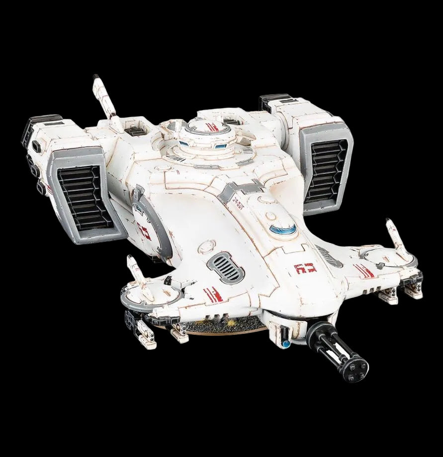 Con questo kit multicomponente di plastica puoi assemblare un Devilfish, un trasporto volante impiegato dall'Impero T'au. Questo agile aeromobile è equipaggiato con un cannone a salva d'impulsi Accelerator sul muso ed è dotato di una coppia di droni arma alloggiati sulla punta delle ali, ognuno armato di doppie carabine a impulsi. I droni possono essere attaccati direttamente al Devilfish o volare separatamente usando le basette e i supporti per velivoli incluse. Il kit comprende anche un missile a ricerca che può essere montato sotto una delle ali del trasporto.