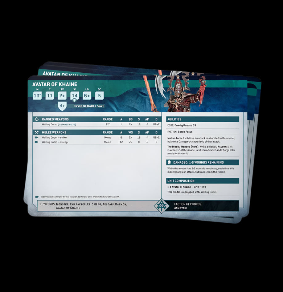 This set of 71 cards will help you keep track of your Aeldari in games of Warhammer 40,000 with individual datasheets for every unit – detailing their profiles, wargear, options, and special abilities. You'll also find a reference card for the Aeldari army rule and special datasheet cards for use in Combat Patrol games.