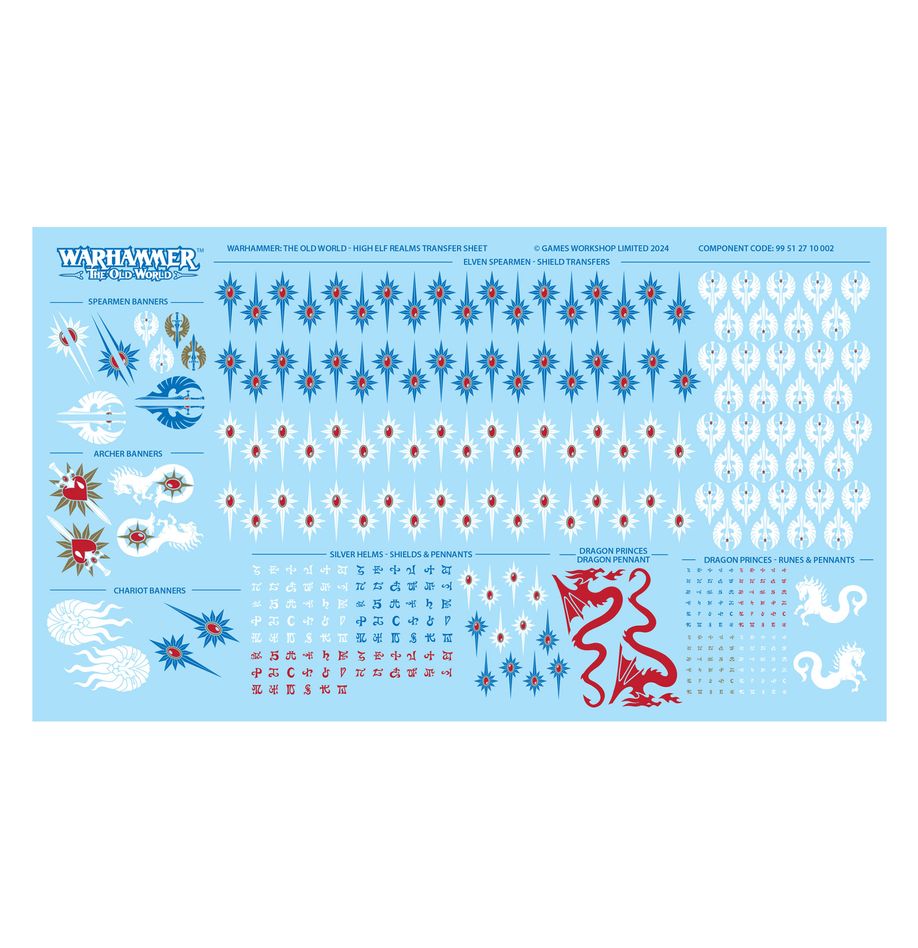Questo kit è formato da 946 componenti di plastica e viene fornito con 2x basette Citadel rettangolari da 50mm x 100mm e 73x basette Citadel quadrate da 25mm. Il set include inoltre 1x foglio di trasferibili degli High Elf Realms, contenente 356 decalcomanie ad acqua di alta qualità da usare per decorare i tuoi modelli.