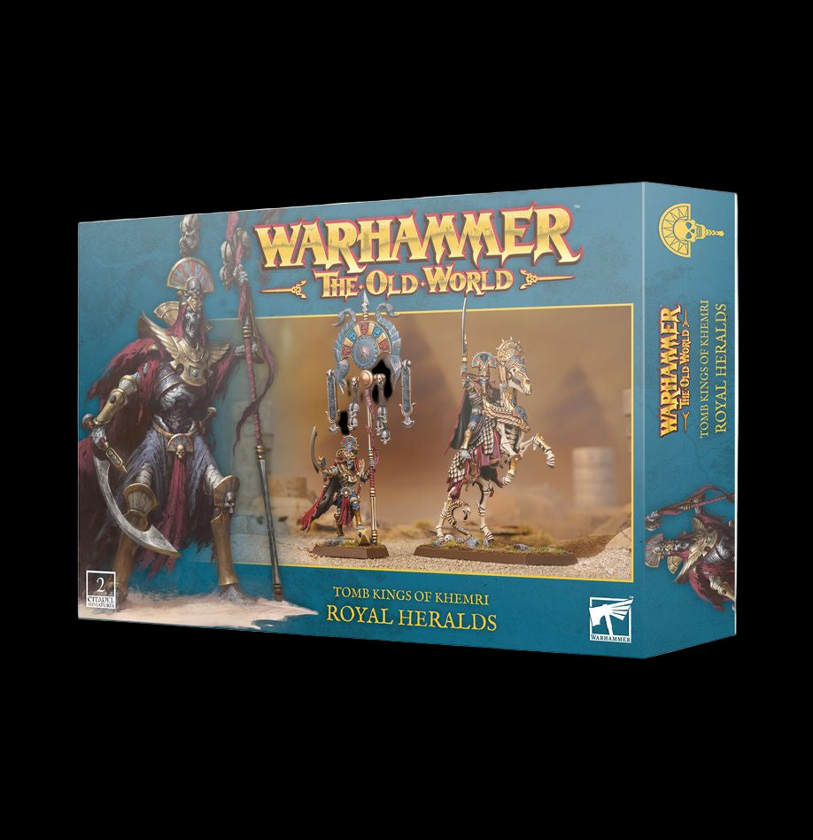 This multipart plastic kit builds two Royal Heralds – one on foot and one mounted on a barded skeletal steed – potent champions for your Tomb Kings of Khemri armies in games of Warhammer: The Old World. Both miniatures can be used to represent a Royal Herald, Tomb Prince, or Tomb King. These macabre miniatures are ideal for bolstering your army and are powerful warriors in their own right.