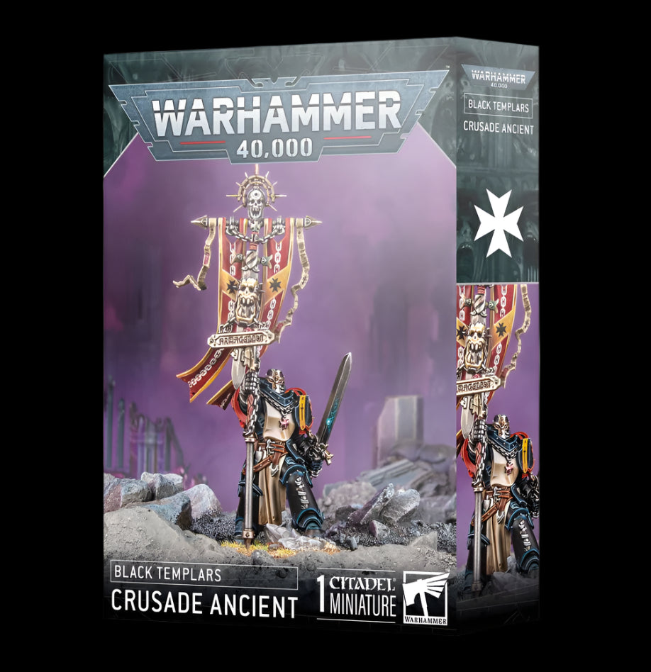 Crusade Ancients are veteran wardens and honoured warriors of exceptional resolve and determination who carry icons and sacred standards into battle. They raise high the tapestries depicting the crusade’s victories and the God-Emperor’s glory, inspiring their fellow Black Templars to greater heights of weaponised hate.