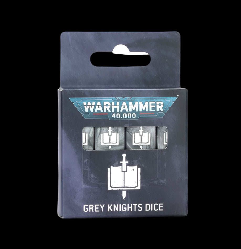 This is a set of 16 six-sided dice with squared edges for use in games of Warhammer 40,000, themed around the Grey Knights. They are cast in pearlised grey acrylic plastic with white ink markings, and measure 16mm along each edge. The 1-5 facings are traditionally pipped and each '6' face is decorated with the daemon-banishing icon of the Grey Knights.