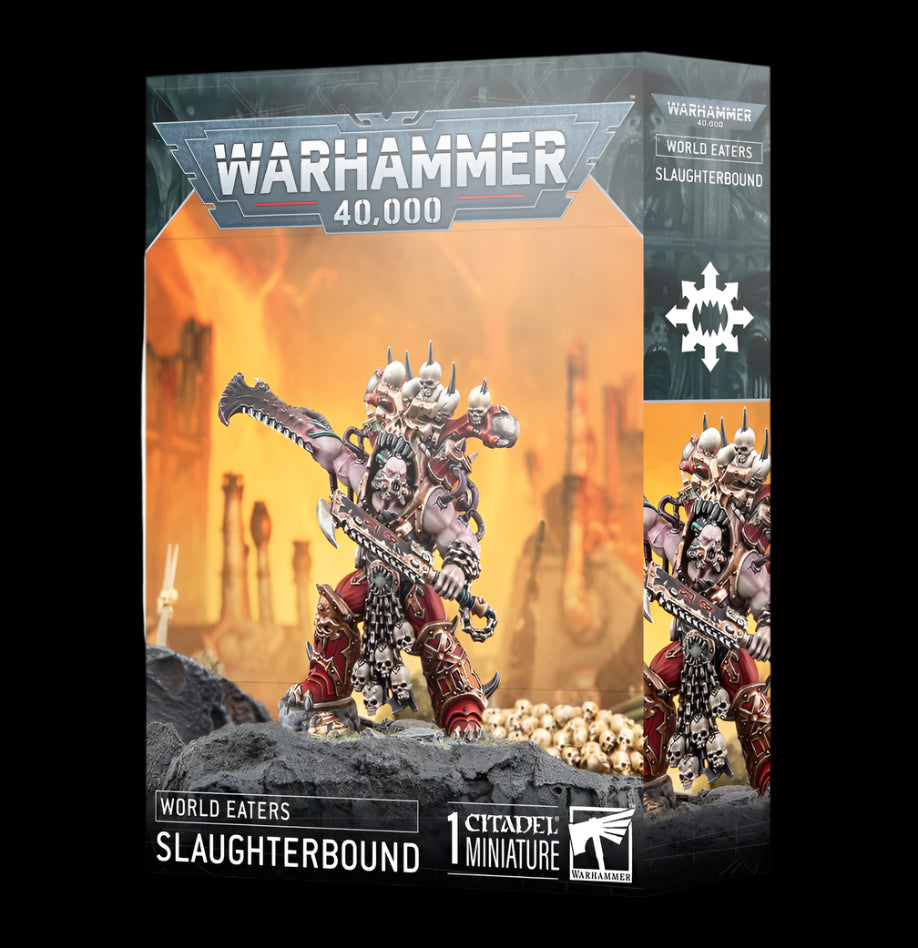 This multipart plastic kit builds one Slaughterbound, a mighty daemon-possessed warrior for your World Eaters armies in games of Warhammer 40,000. This savage leader offers a bloodthirsty way to add even more hitting power to your charge, and inspires nearby warriors to even greater acts of skull-taking. He can be assembled with one of two different heads, and with or without an icon of Khorne rising over his head, offering a degree of customisation to your Bloodthirster-possessed brute.